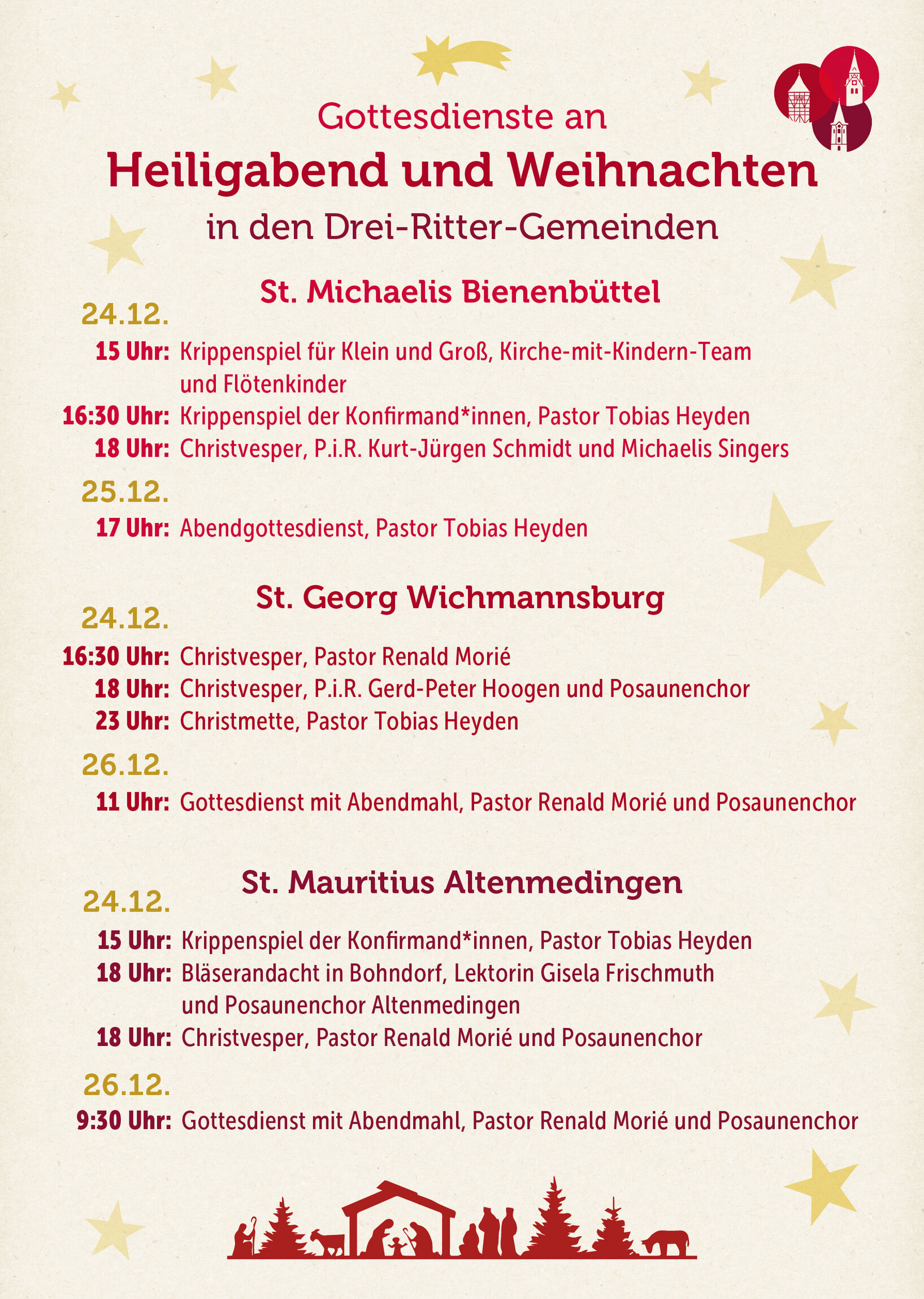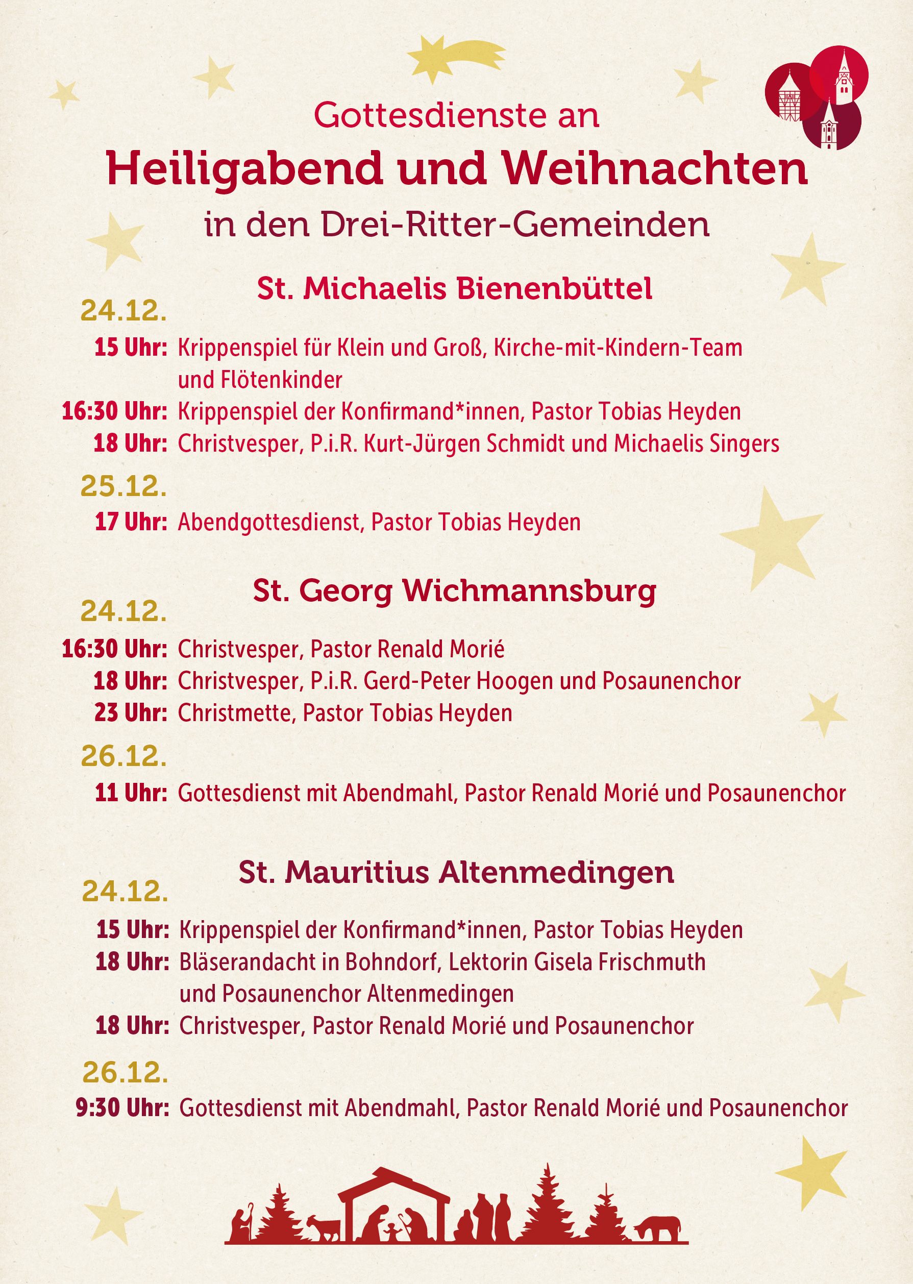 Wir laden Sie und Euch herzlich zu unseren Gottesdiensten und Krippenspielen an Heiligabend & Weihnachten in unseren Drei-Ritter-Gemeinden ein:
