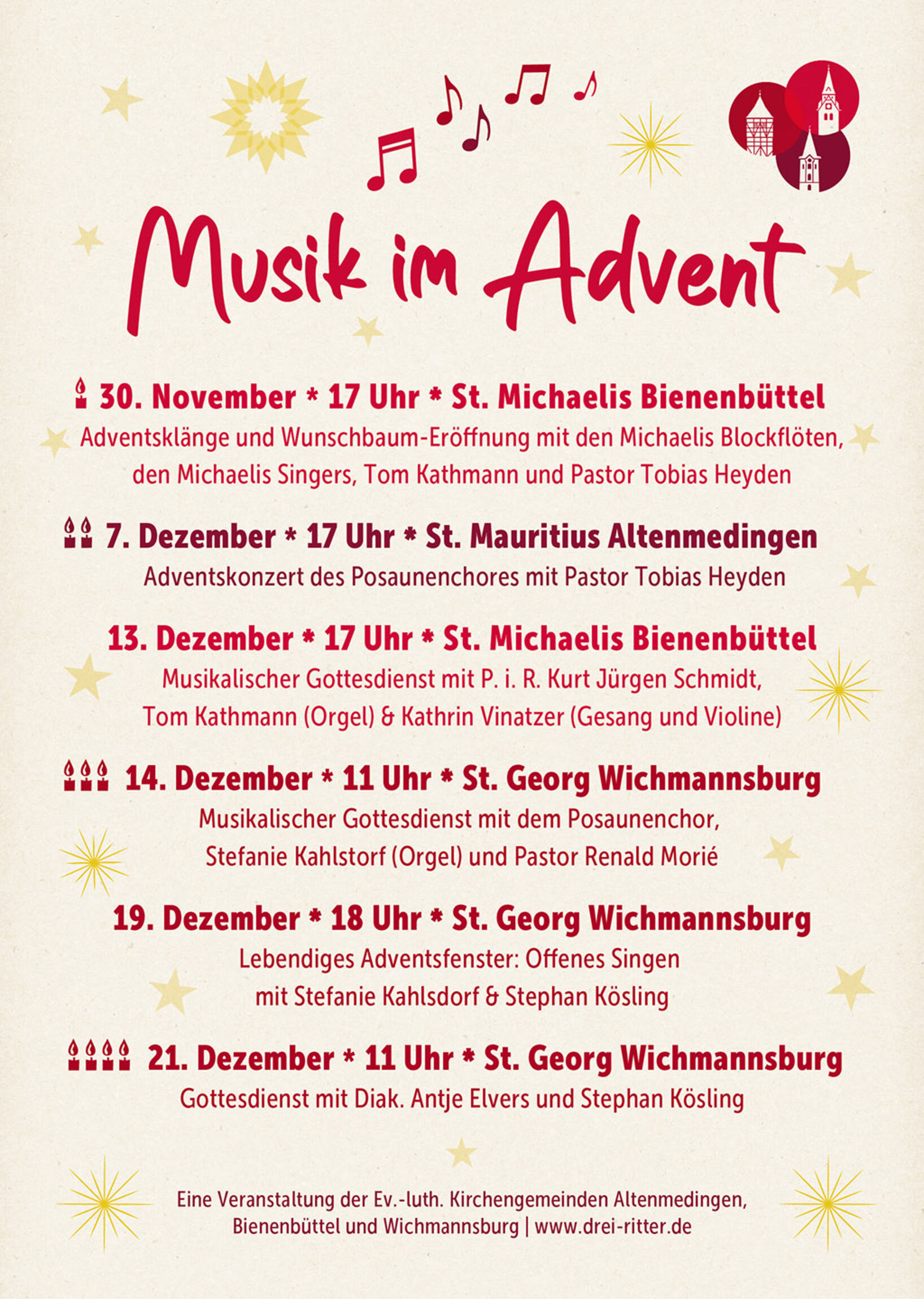 "Wir sagen Euch an, den lieben Advent" und laden Euch herzlich zu unseren musikalischen Gottesdiensten, Konzerten und zum gemeinsamen Singen im Advent ein.